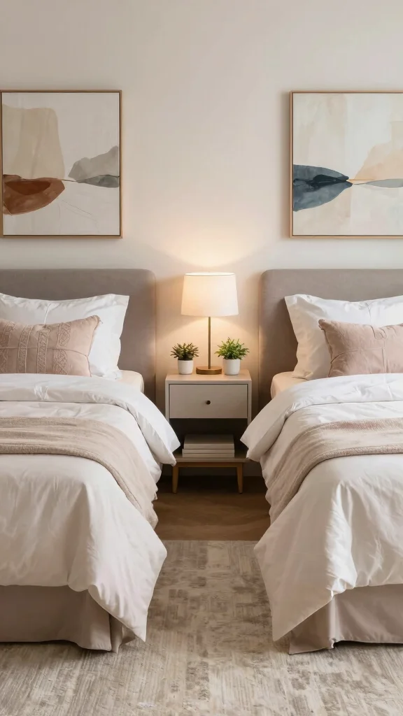 If you prefer a classic look, positioning two twin beds side by side with a shared nightstand can create a warm and inviting atmosphere. This layout allows each person their own sleeping space while fostering a sense of togetherness. Choose a narrow nightstand that provides enough room for lamps and personal belongings without dominating the space.