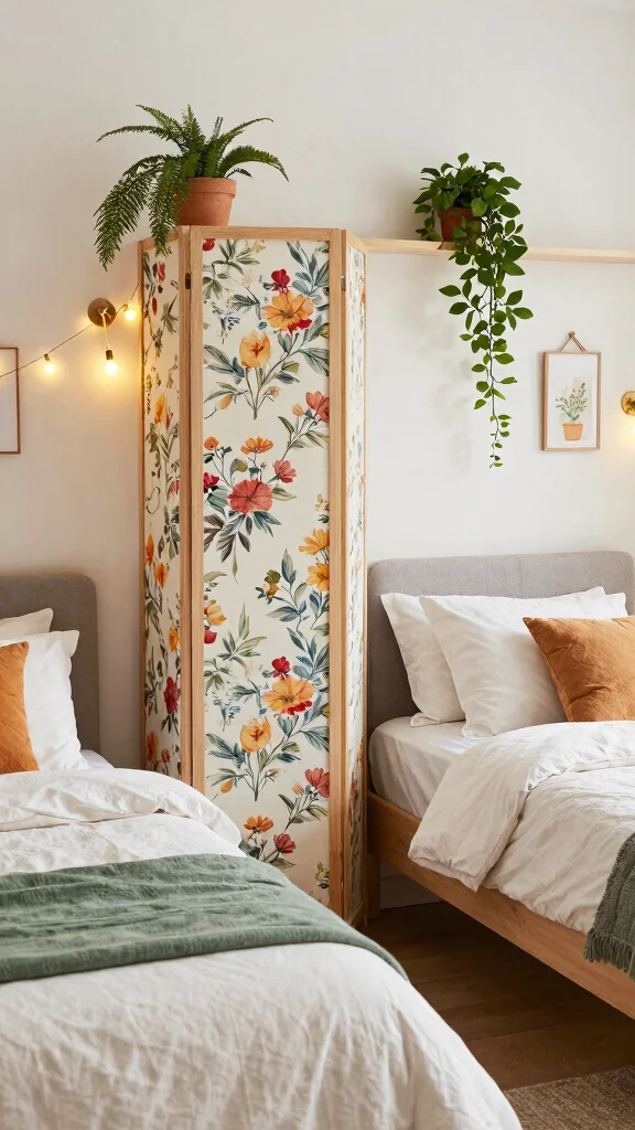 Enhance the divider with plants or string lights to add warmth and charm. This setup is particularly useful for siblings or roommates who appreciate a bit of personal space while still sharing a room. The division allows for individual decorative choices while fostering a cozy environment.