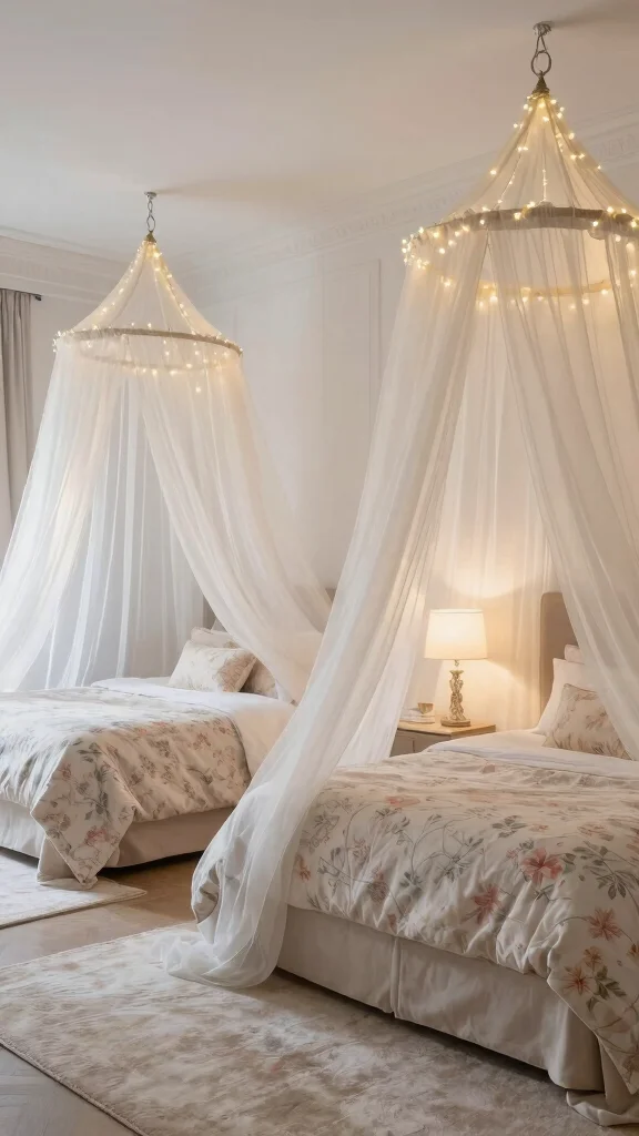 This airy ambiance keeps the room feeling open and spacious. Decorate the canopies with fairy lights or garlands for a whimsical touch, transforming the beds into dreamy retreats. Mixing bedding styles can also add character while maintaining a cohesive color scheme.