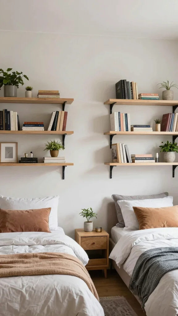 Focus on efficient storage solutions that double as design features. Opt for under-bed drawers, wall-to-wall built-ins, or a storage bench between beds. Use a floating desk or wall-mounted shelves to free floor space. Consider identical nightstands with integrated drawers or a shared chest that doubles as seating.