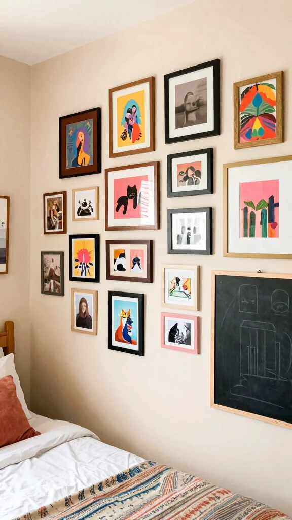 Mix frames of different sizes and styles for a dynamic look, and include personal touches like school photos or favorite quotes. A cohesive theme can enhance the overall aesthetic, and interactive elements like chalkboards add a fun, creative vibe.