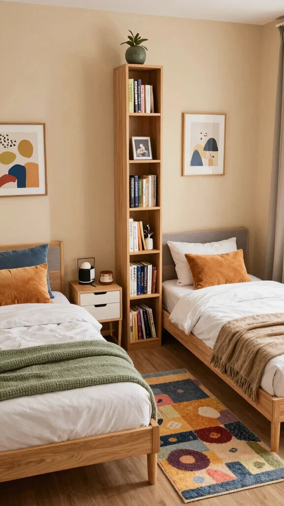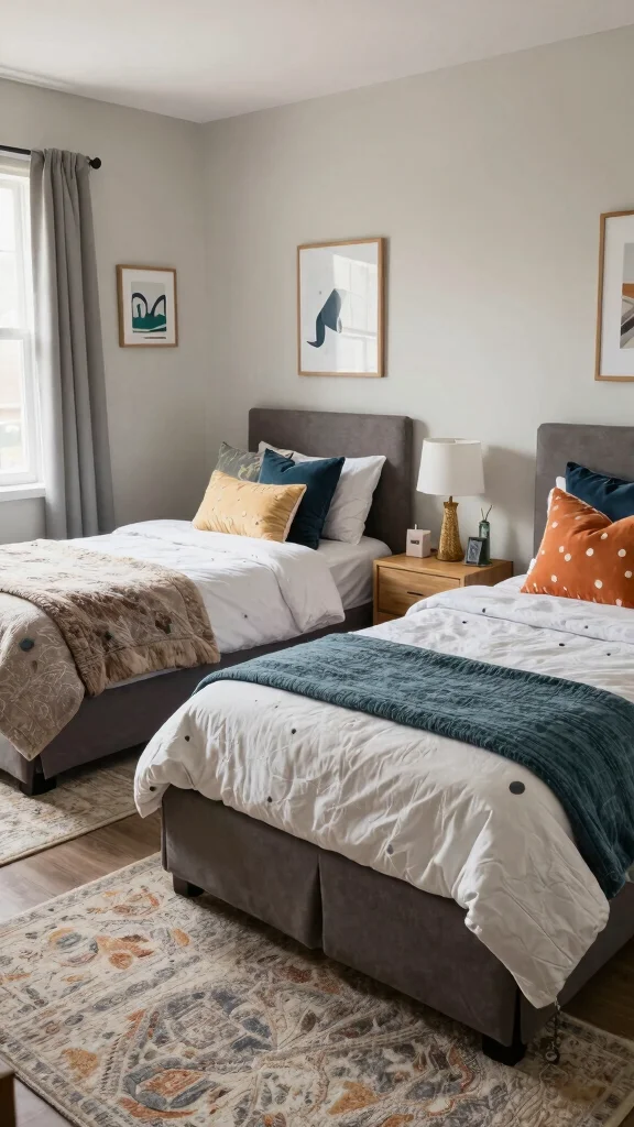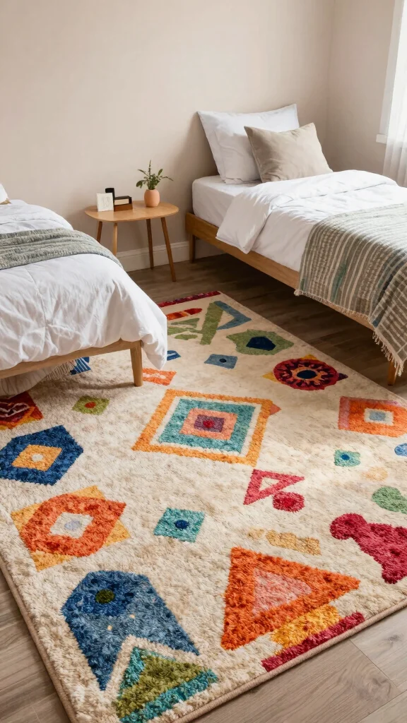 Don’t underestimate the impact of a well-chosen rug to unify a shared bedroom! A stylish area rug can add warmth while providing a soft surface underfoot. Choosing the right rug involves balancing aesthetics with practicality.