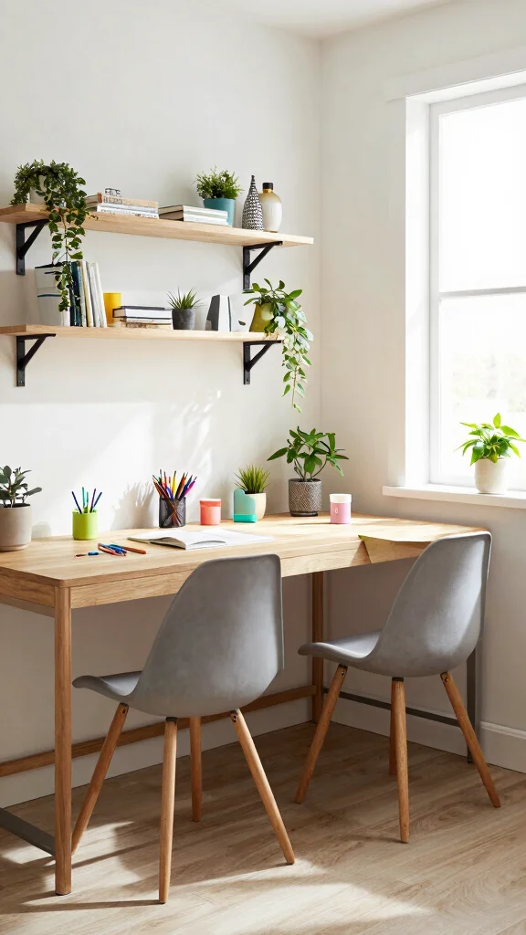 Position a large desk that accommodates two users comfortably, and invest in ergonomic chairs to support proper posture. Use organizational tools to keep supplies tidy, and allow personal touches like fun stationery to make the desk inviting.