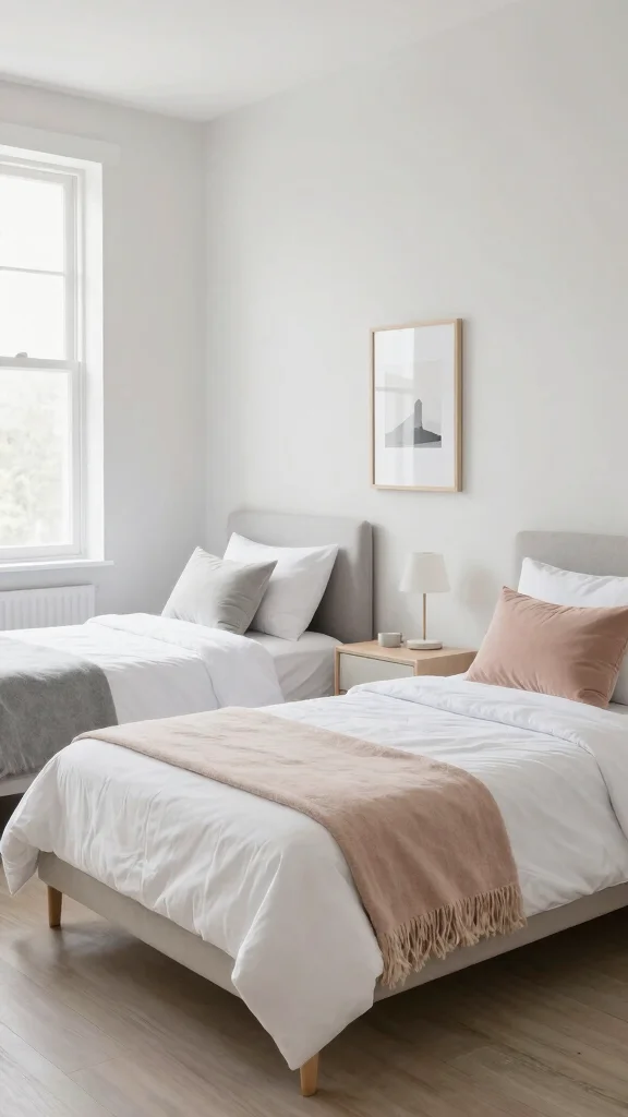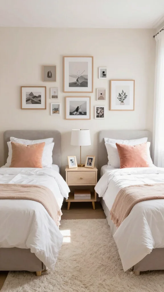 Arranging two twin beds with a shared nightstand creates a sense of unity and warmth in any shared room. This setup not only enhances the coziness but also fosters connection between the occupants. Choose a stylish nightstand that complements the decor while serving as a functional piece for lamps and books.