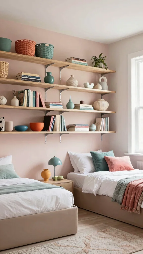 Incorporating floating shelves into a shared bedroom design is an effective way to add storage without sacrificing floor space. These shelves not only display books and toys but also enhance the visual interest of the walls.