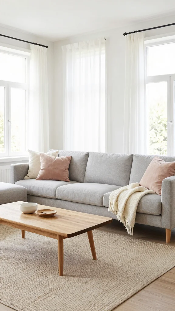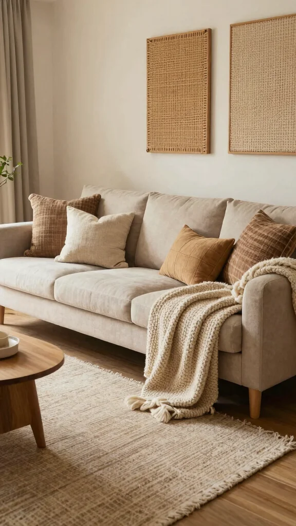 To enhance this aesthetic, consider adding a sleek coffee table and a few thoughtfully chosen decor pieces that echo the sofa’s understated elegance. Budget-friendly options like second-hand finds can easily fit into this design approach.
