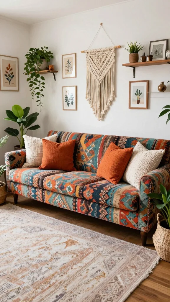 To elevate your boho sanctuary, consider draping a fringed throw and surrounding your sofa with plants and woven baskets. Look for unique, handcrafted items at local markets to enrich your space without breaking the bank.