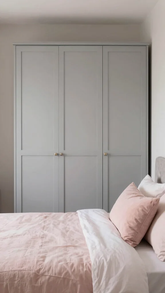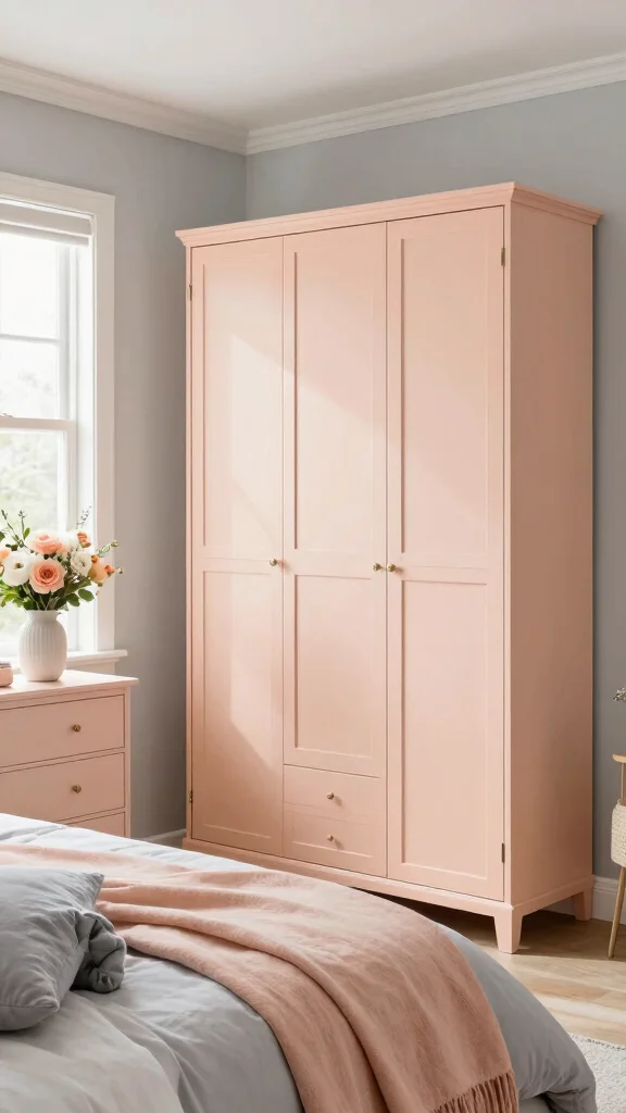– Use pale peach for the wardrobe and soft grey for the walls for contrast.