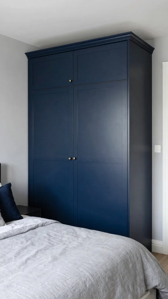 – Use navy in larger pieces like the wardrobe to ground the space.