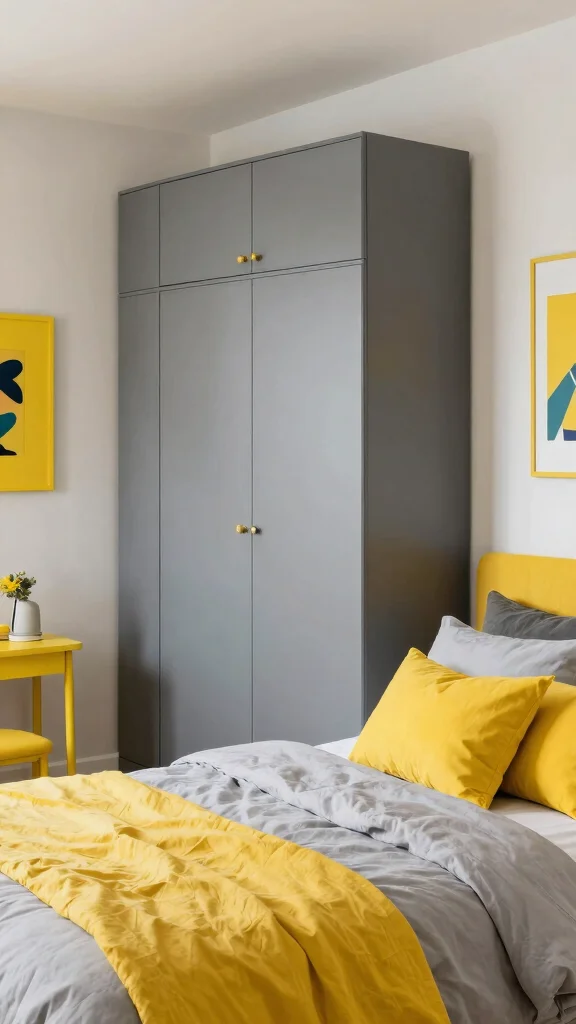 Fun fact: A bold yellow and cool grey bedroom wardrobe colour combination can boost perceived space by up to 15% and lift mood by about 20%. Keep yellow accents in small decor items for balance and focus.