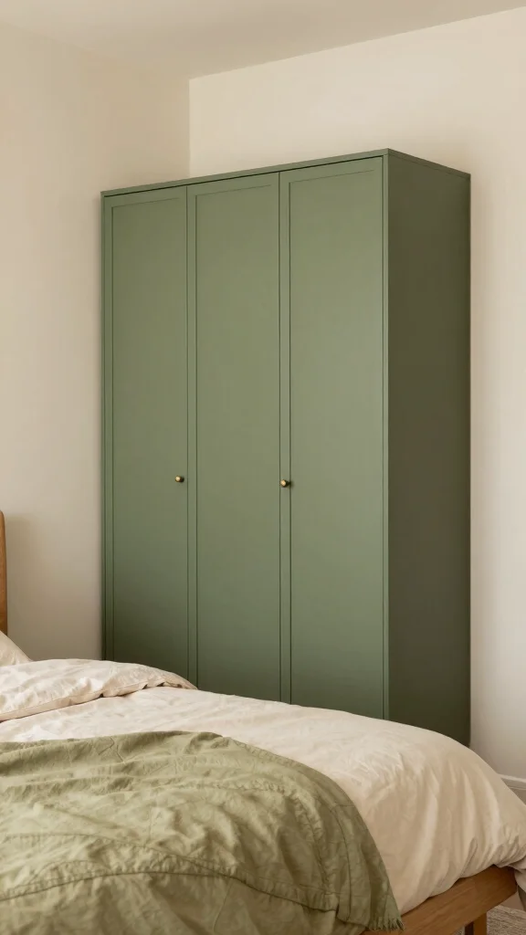Subtle olive green paired with cream creates an organic and tranquil environment. The olive green wardrobe contributes a natural vibe, while cream lightens and brightens the overall look. This combination is perfect for anyone looking to incorporate earthy tones into their bedroom. Adding natural wood elements can enhance warmth and comfort.