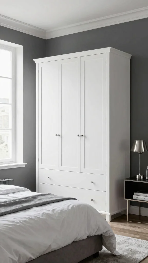 The pairing of classic white and charcoal grey radiates elegance and sophistication. With a white wardrobe brightening the room, charcoal grey introduces depth and a modern touch. This combination can transform your space, making it feel larger while maintaining a chic atmosphere. Consider adding metallic accents in gold or silver to enhance the luxurious appeal of this stylish duo.