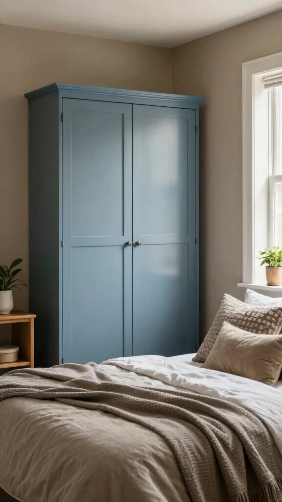 Dusty blue and warm taupe create a gorgeous harmony that feels both inviting and calming. The muted dusty blue wardrobe offers a touch of color without overwhelming the senses, while taupe brings a comforting warmth. This combination is perfect for crafting a tranquil bedroom atmosphere, filled with depth and comfort. Brightening the scheme with cream or beige accents can enhance the overall appeal.