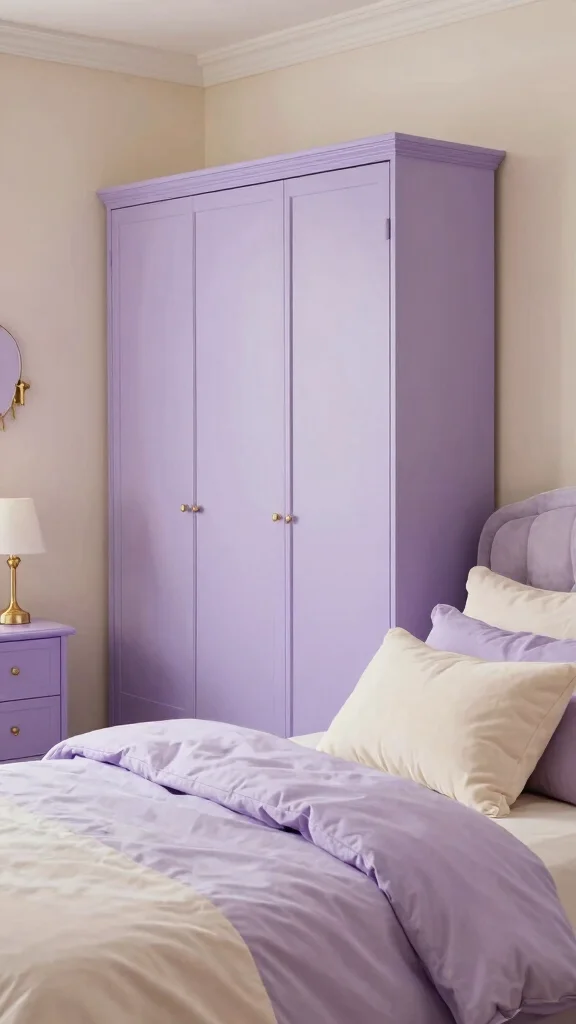 Soft lavender paired with cream creates a dreamy and romantic ambiance perfect for a cozy bedroom. The lavender wardrobe serves as a soothing focal point, while cream enhances the lightness and airiness of the space. This combination is not only stylish but also promotes tranquility, making it an ideal retreat. Incorporating subtle floral patterns in the bedding adds an extra touch of charm.