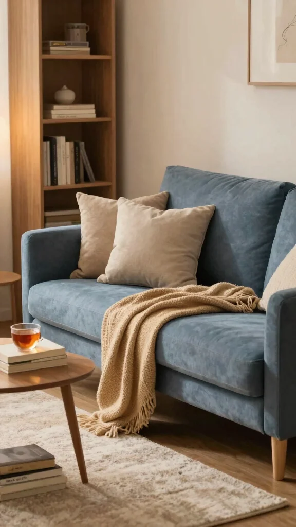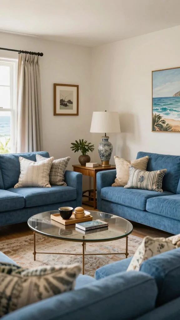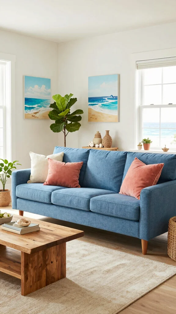 Keep accessories minimal but deliberate: a coastal lamp, a few textured pillows, and a hint of blue couch decor will complete the look without clutter.