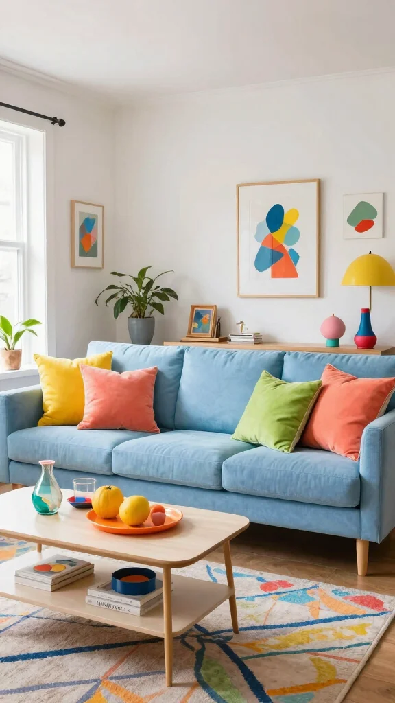 Use vibrant accent colors like coral or gold to create visual interest against a blue sofa backdrop.