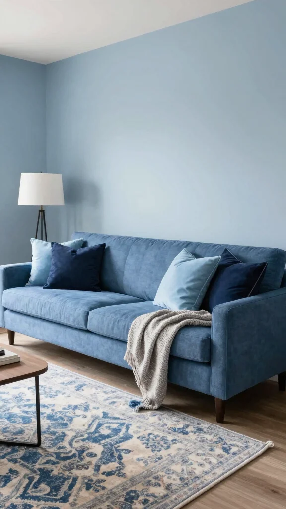 Use variations of the blue (lighter cushions, a navy throw) to add depth without overwhelming the room.