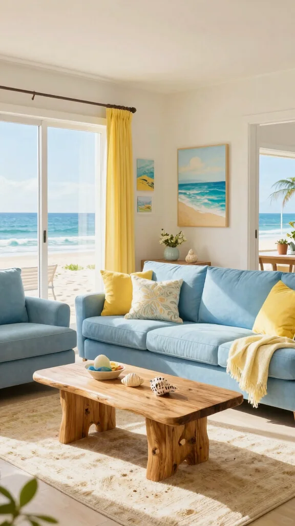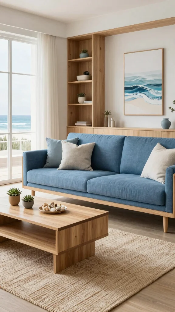 Incorporate soft blues and sandy neutrals to evoke a serene coastal vibe in your living room.