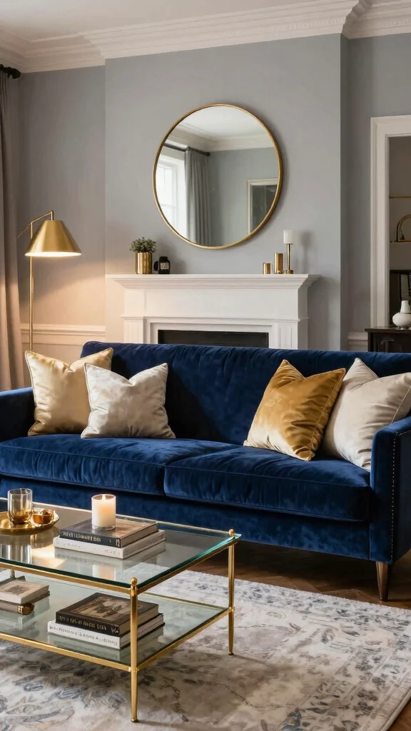 Pro Tip: A navy blue sofa with gold accents elevates your blue sofa living room ideas—pair it with soft, light walls for balance. Add velvet cushions in complementary tones and sparkly throws to keep the space inviting and chic, without breaking the budget.