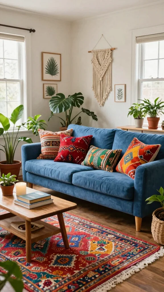 A blue sofa serves as a perfect anchor for a bohemian-inspired living room, embracing a free-spirited aesthetic. Layering diverse patterns, textures, and colors creates a vibrant environment that feels alive. Think about mixing tribal print throw pillows with colorful rugs and an abundance of greenery to amplify the boho vibe. This eclectic mix invites creativity and warmth into your space.