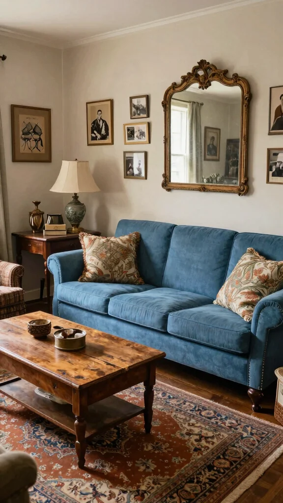 Integrating vintage charm into your living room can create a warm and inviting atmosphere. A blue sofa beautifully complements antique furniture and retro decor, infusing the space with character. Picture pairing the sofa with vintage side tables, a classic rug, and leather accents to evoke a nostalgic feel. This blend of styles adds depth and a story to your room.