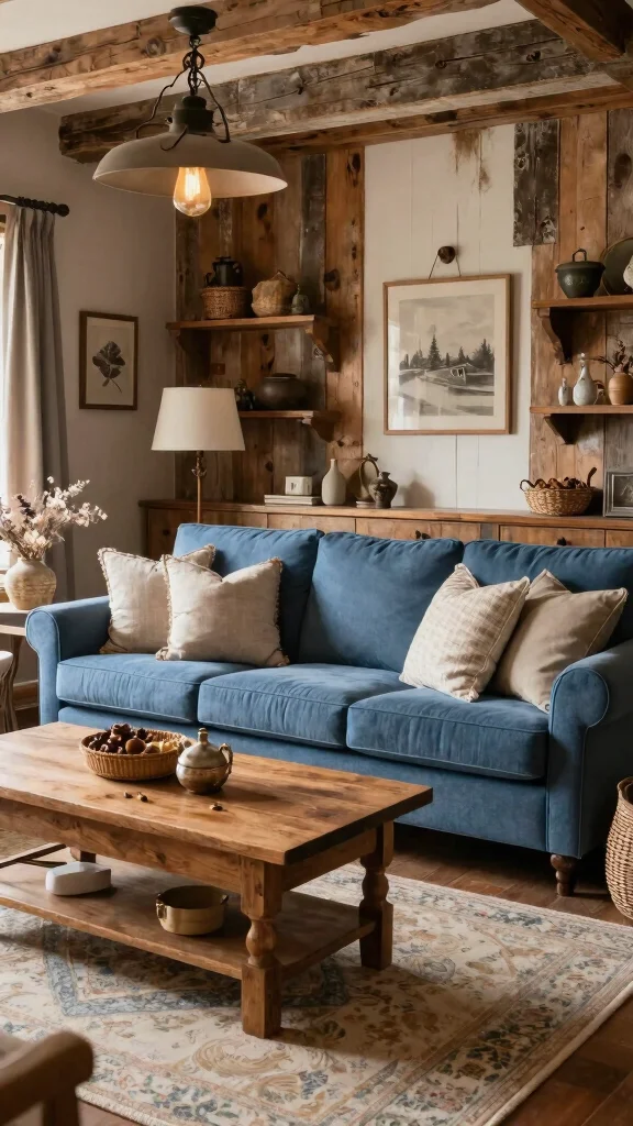 A blue sofa can beautifully blend into a rustic farmhouse-inspired living area, creating a cozy atmosphere. The warmth of wood combined with soft fabrics enhances the inviting feel of the space. Think about incorporating reclaimed wood features, like shelves or tables, layered with textiles in neutral tones for a welcoming vibe. This design approach connects to the trend of comfort and simplicity in home decor.