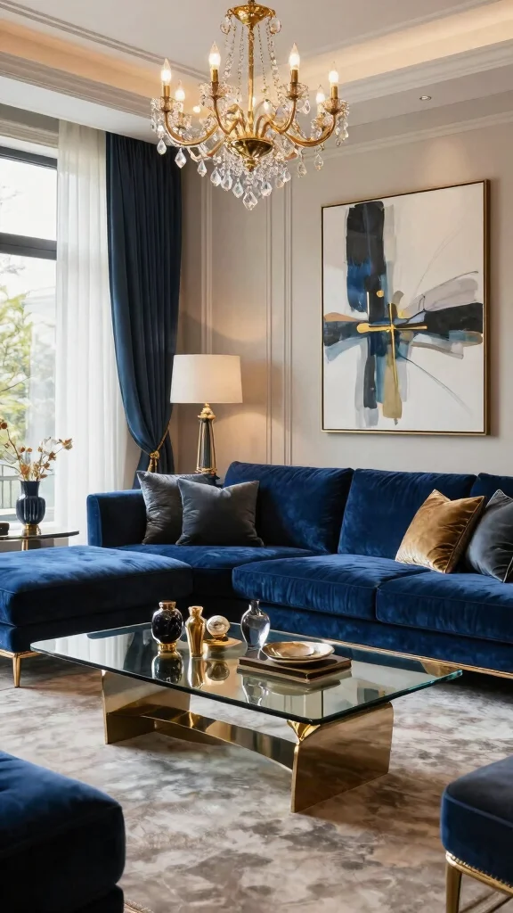 A navy blue sofa paired with luxurious gold accents brings an air of sophistication to your living room. This striking combination creates a sense of elegance, making the space feel both rich and inviting. Imagine complementing the deep navy with soft, light-colored walls and plush fabrics to achieve a balanced and chic appearance. Incorporate velvet cushions or a decorative throw in a complementary shade to enhance the luxurious feel.