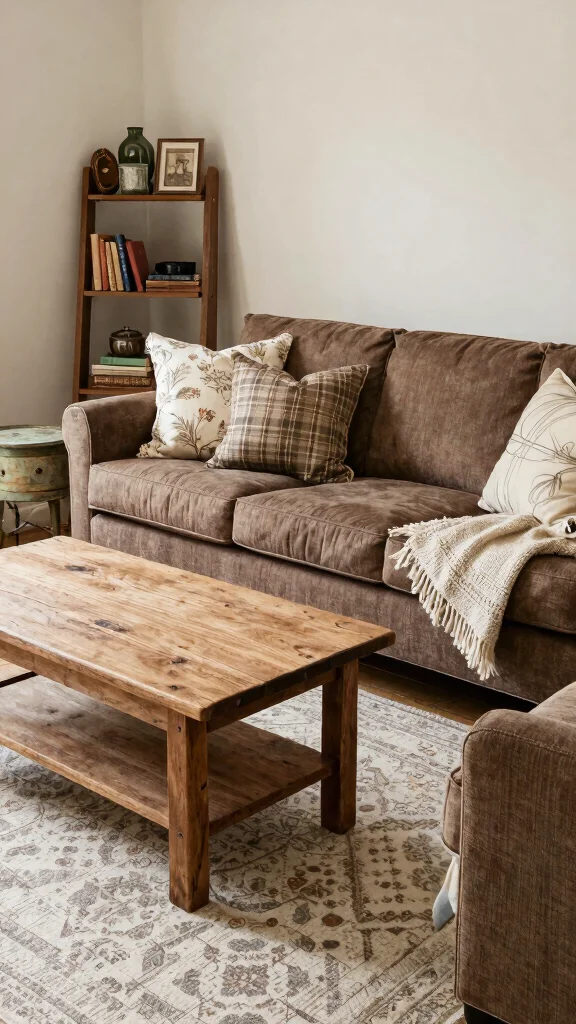 To achieve this rustic look, consider using items that blend functionality with aesthetics. Think about incorporating a vintage trunk for extra storage or a ladder shelf adorned with books and trinkets. A neutral rug with subtle patterns can ground the overall design and allow the brown sofa to take center stage.