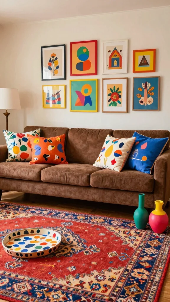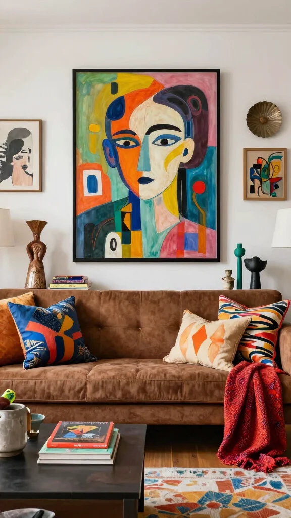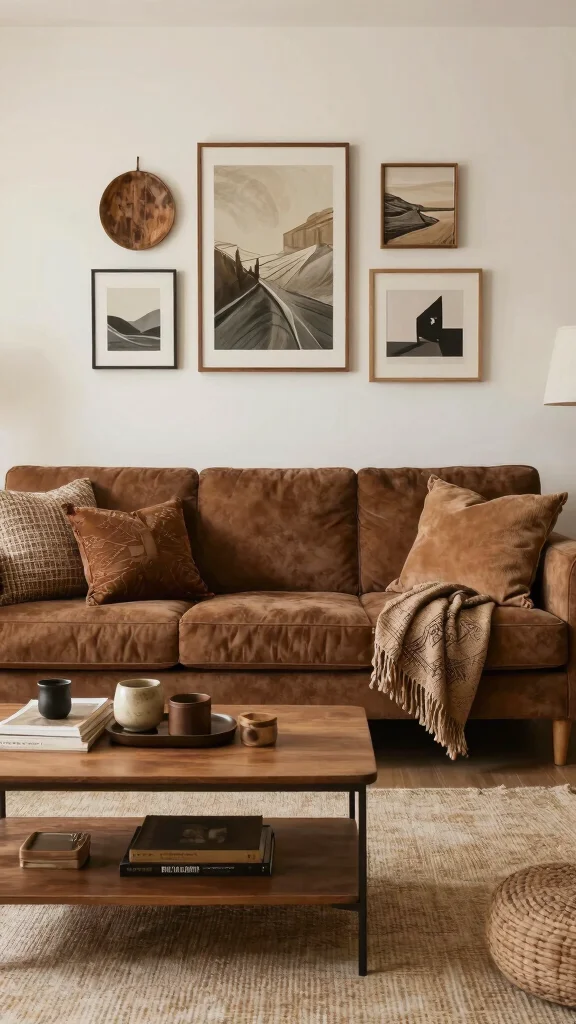 Curate a selection of decor items, including artisanal crafts, vibrant textiles, and decorative books, around your sofa. Throw pillows in bold colors or abstract patterns can add an artistic touch that complements the rich brown.