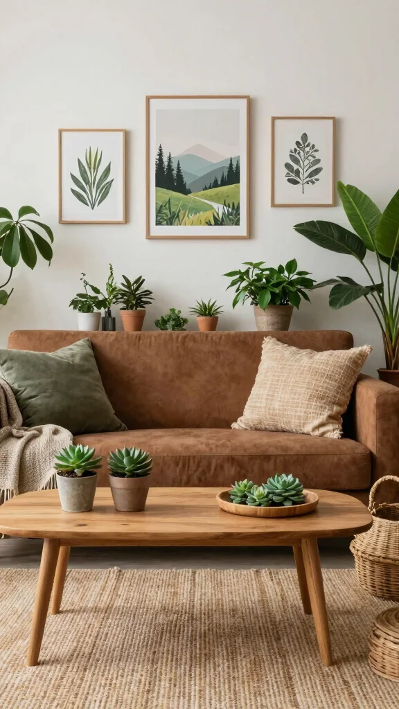 Transforming your brown sofa into a nature-inspired haven isn’t magic—it’s daily choices. Add a few leafy greens, a wooden coffee table, and botanical art, and your living room becomes calm, cozy, and effortlessly stylish.