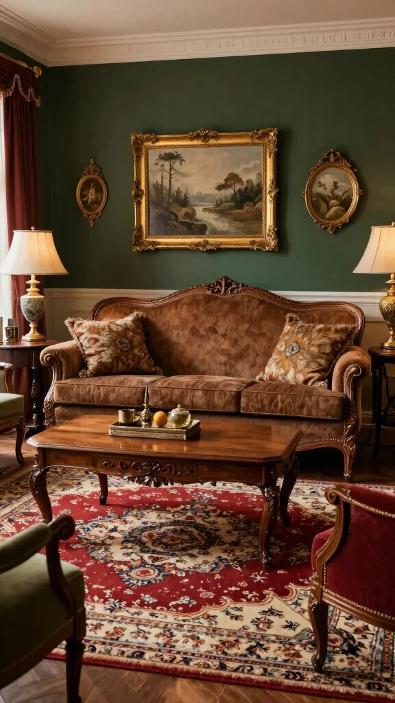 Use antique or traditional furniture pieces, like a wooden coffee table or beautifully carved side chairs, to enhance the timeless aesthetic. Accessorize with vintage-style decor, such as ornate frames or elegant vases, for added charm.