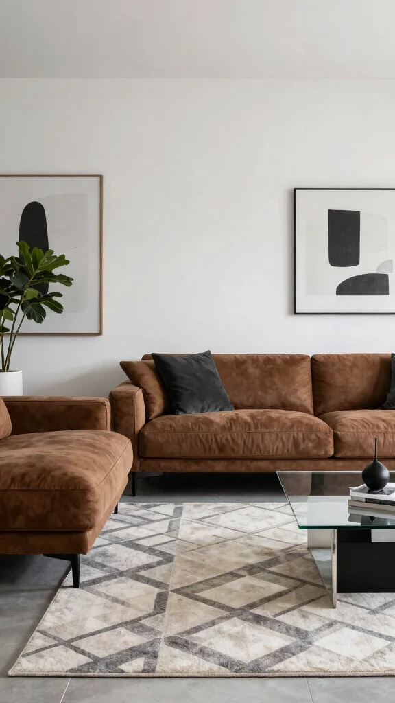A geometric patterned rug can add visual interest while maintaining a sophisticated look. Accessorize with abstract art or monochromatic pieces to keep the overall design cohesive.