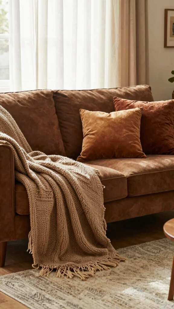 Finally, warm and inviting textiles can transform your living room around a brown sofa into a cozy haven. Layering different fabric types—such as soft cotton, wool, and textured knits—creates a sense of comfort and warmth in the space.