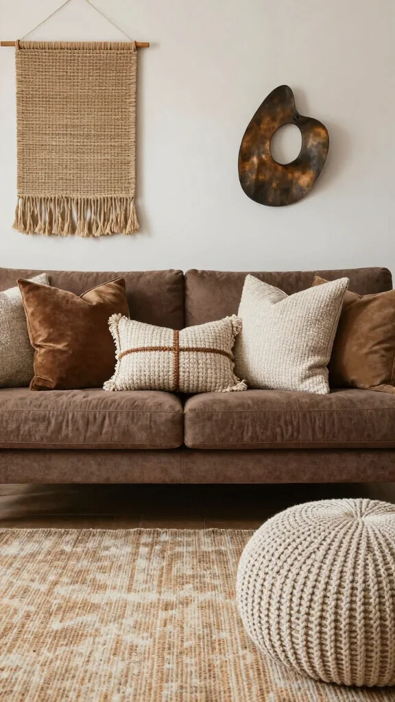 Elevating your living room’s design can be accomplished by layering various textures around your brown sofa. This technique works beautifully, as it transforms a simple space into a vibrant and dynamic environment. Start by selecting throw pillows made from different materials such as velvet, chunky knits, and soft cotton to create visual intrigue.