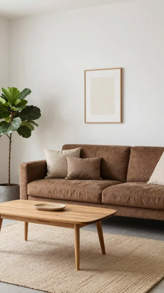 If you appreciate simplicity, a minimalist approach with a cozy twist can create a perfect living space around your brown sofa. This style works effectively as it allows the richness of the sofa to shine against a backdrop of neutral walls and modest decor. Focus on minimal furnishings to maintain a clean, uncluttered look.