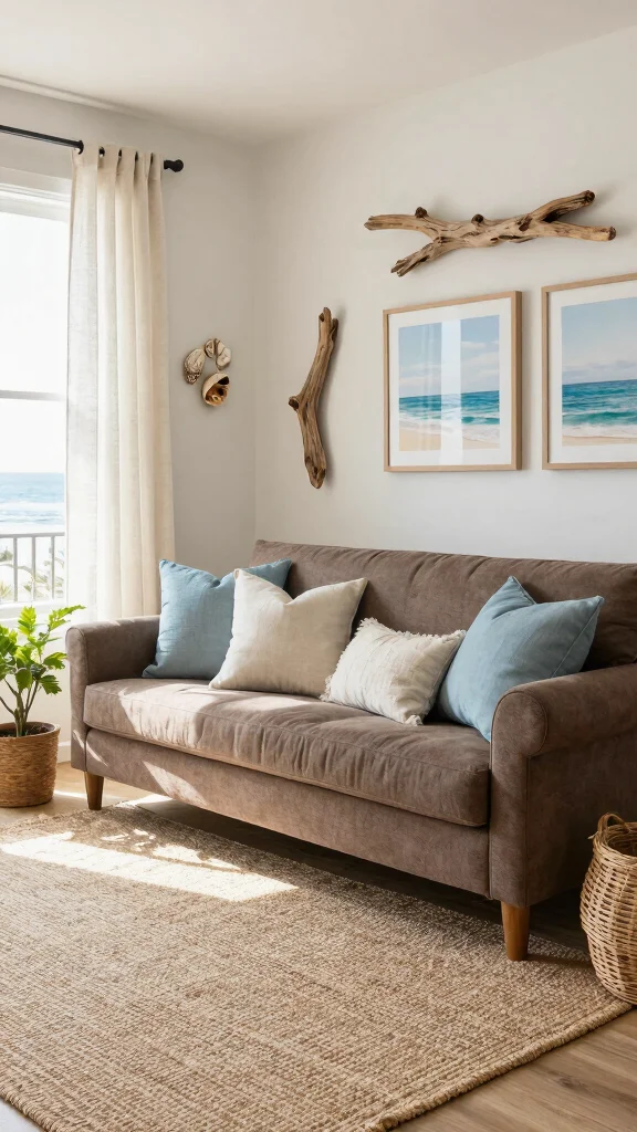 This coastal decor approach envelops your living room in a soothing ambiance, perfect for relaxation and tranquility.
