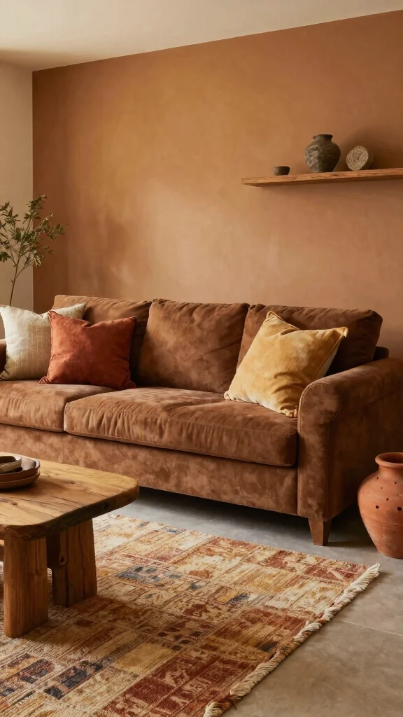 Begin with warm-toned throw pillows and blankets that reflect autumn leaves or sunbaked earth. A patterned area rug featuring these earth tones can tie the entire look together.
