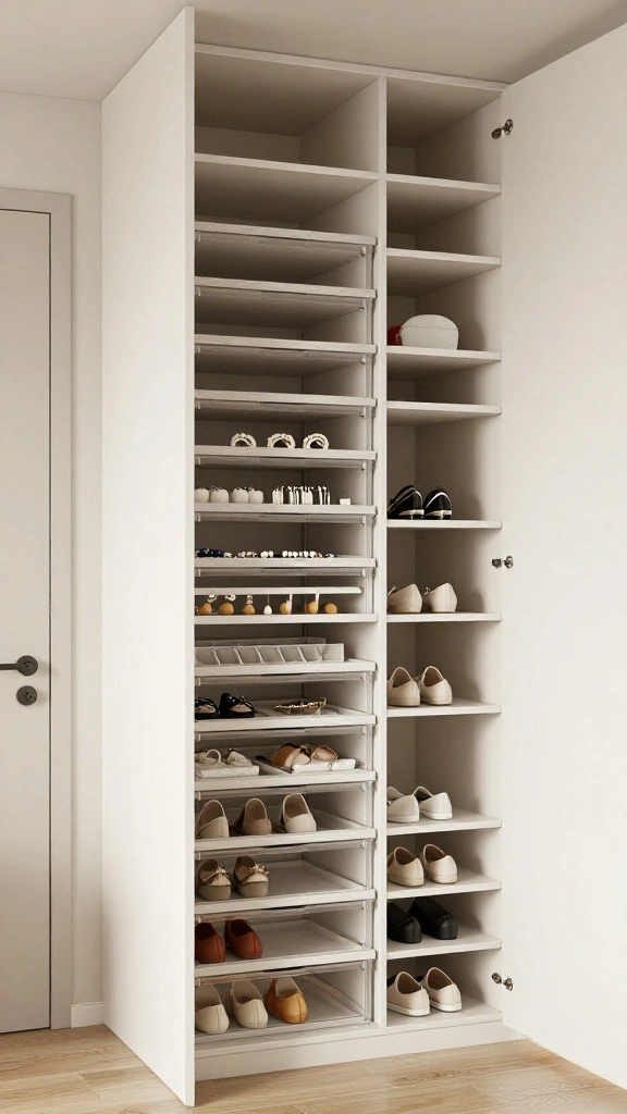 To make the most of this design, opt for adjustable shelving to accommodate various heights of shoes or foldable items. Consider budget-friendly options like DIY mirrored panels to add a touch of elegance without breaking the bank. This approach aligns with the trend of creating personalized, organized spaces while enhancing your daily routines.
