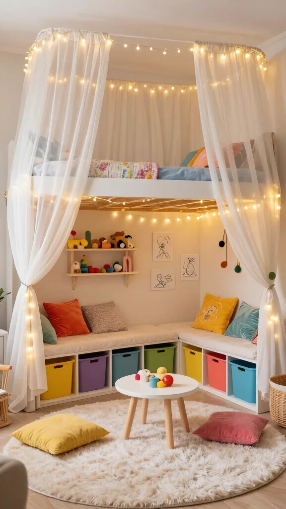 By utilizing wall and corner areas, you can create a cozy nook perfect for your little one’s activities. Add wall-mounted shelves above the bed for books and decorations to keep the area organized and stylish.