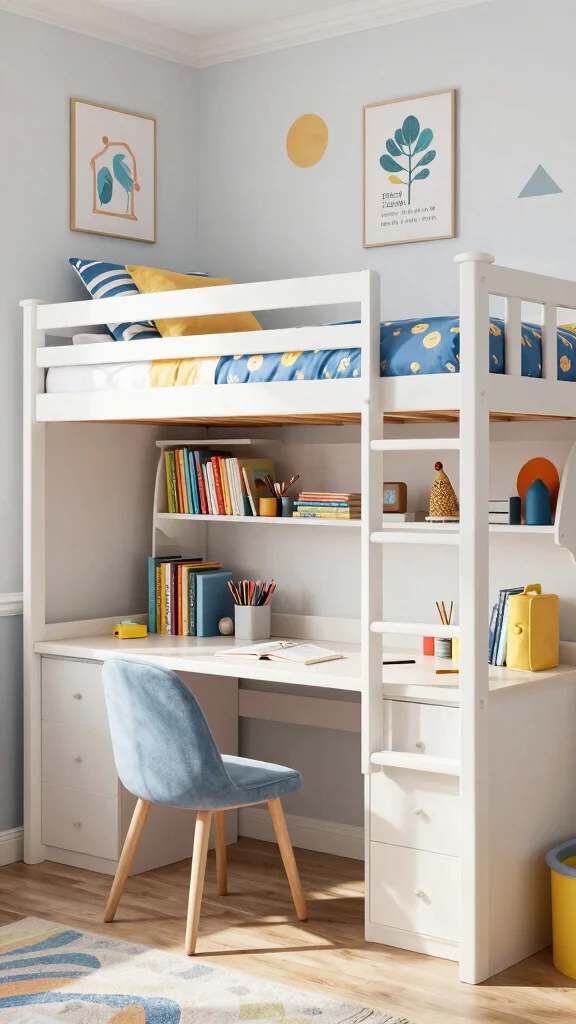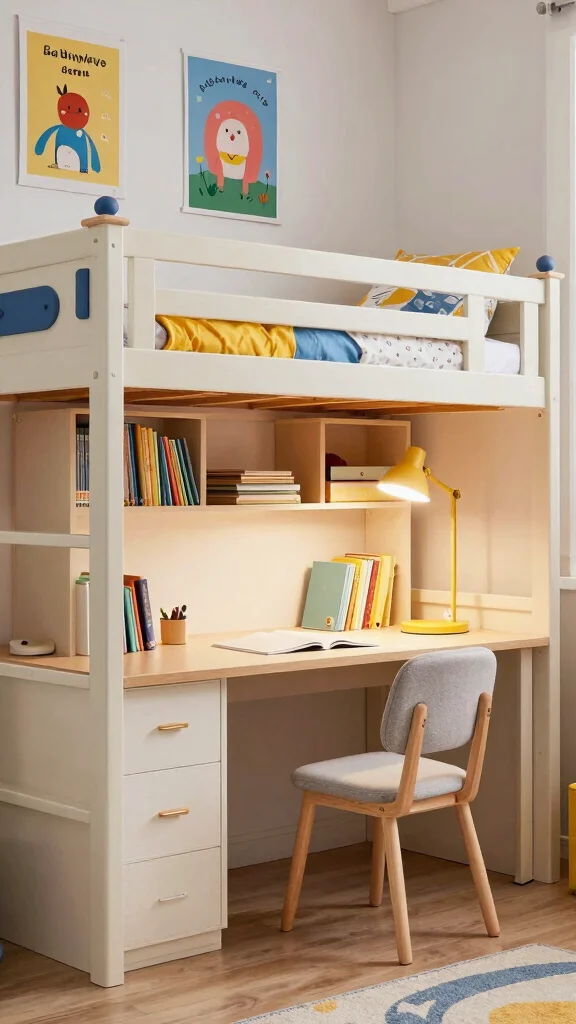Transforming a bunk bed into a lofted play space can ignite your child’s imagination! This clever design allows for a fun zone underneath, making the most of limited room space. Picture a cozy nook with brightly colored cushions, a small table for crafts, and storage bins for toys, all nestled below the elevated bed.