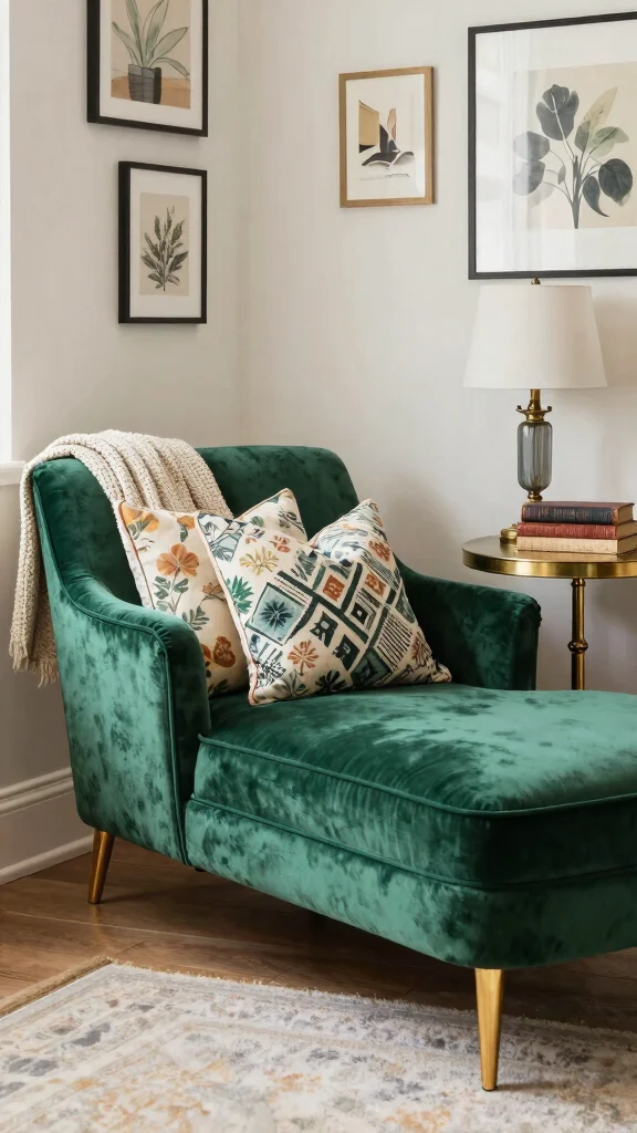 Embrace the luxurious charm of a vintage velvet chaise lounge chair, ideally positioned in a cozy corner. The rich emerald green fabric shimmers beautifully in natural light, creating an inviting atmosphere. Velvet’s soft texture adds warmth, making it an ideal choice for a space where you want to relax and unwind. Pair this striking piece with mismatched cushions and a knitted throw to amplify the cozy vibe and enhance your decor.