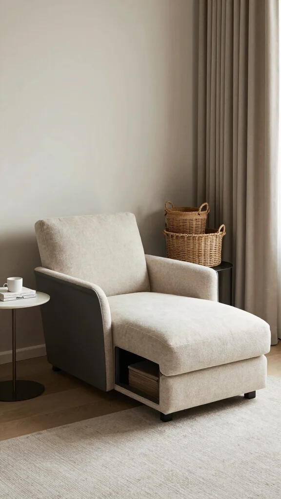 Hidden storage on a chaise lounge chair turns cozy evenings into tidy bliss. Slide blankets, pillows, and magazines into a built-in compartment, grab a sleek side table, and enjoy a cohesive, clutter-free corner.