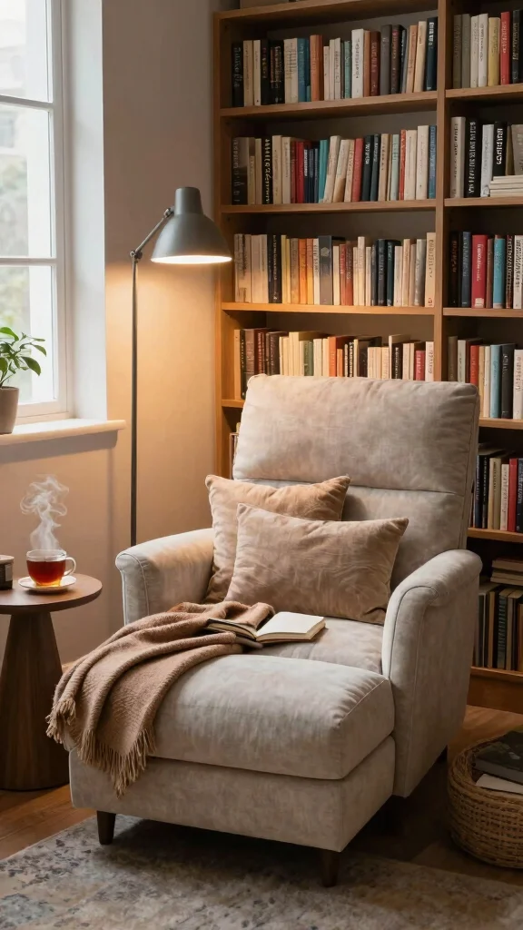 Create a cozy reading nook with a chaise lounge chair that invites you to settle in with a captivating book. Choose a plush chair with deep cushions and soft fabric, ensuring maximum comfort. A small side table for your coffee or tea is essential, keeping your favorite treats close at hand.