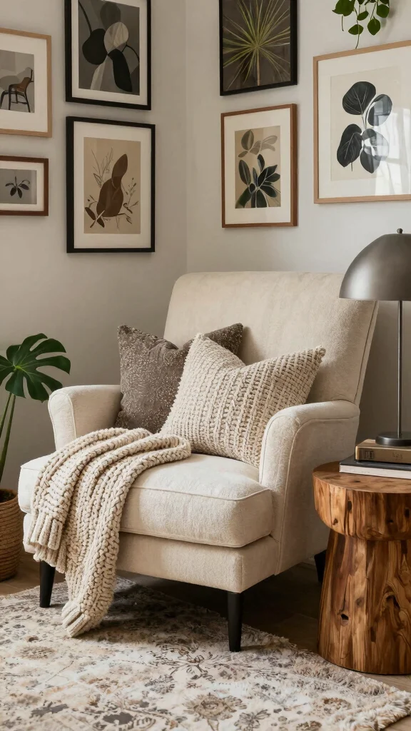 Layering is crucial—add a plush throw blanket and a few soft pillows for that inviting touch. Surround your nook with bookshelves filled with your favorite reads, and consider including a small floor lamp for those late-night reading sessions.