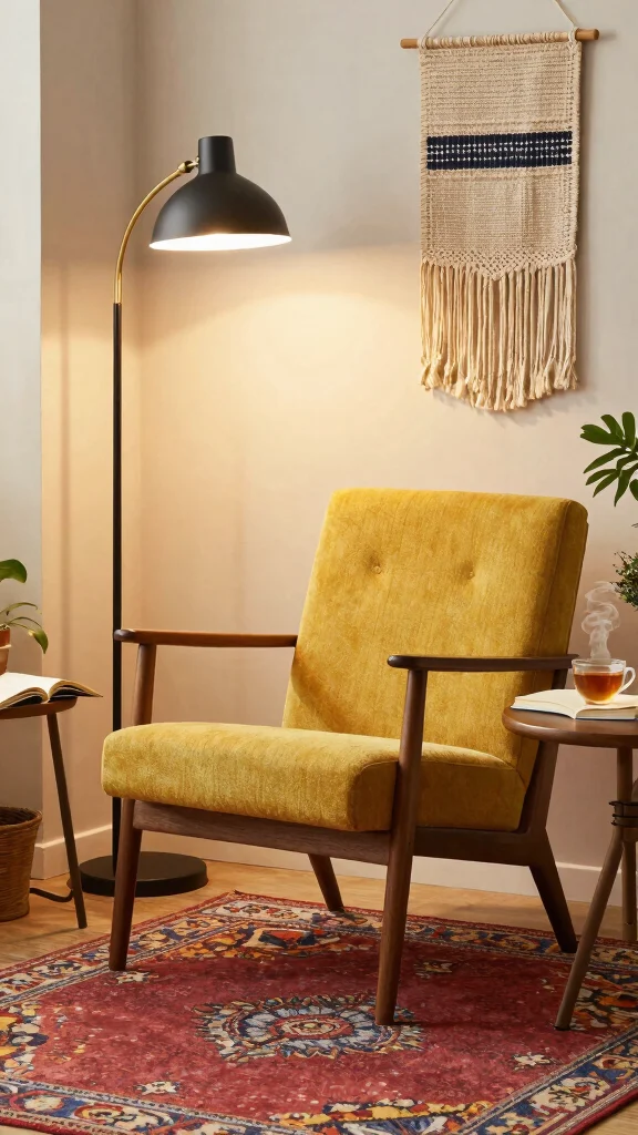 A mid-century modern chair, combined with a vintage lamp, creates an inviting reading nook where you can enjoy your favorite stories anytime.