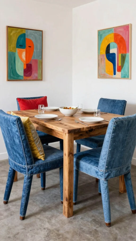 Upcycled denim chairs are a creative and eco-friendly option for your dining room. By transforming old jeans into stylish seating, these chairs add a playful and unique touch to your decor, perfect for casual dining or entertaining friends. The eclectic look of denim chairs can be achieved through simple upholstery or completely new designs crafted from denim fabric.