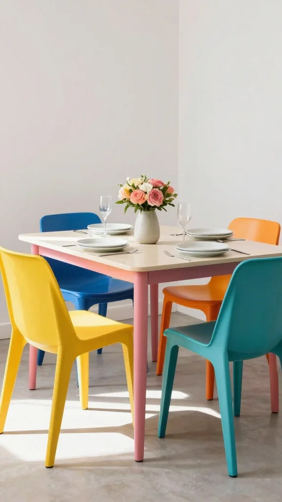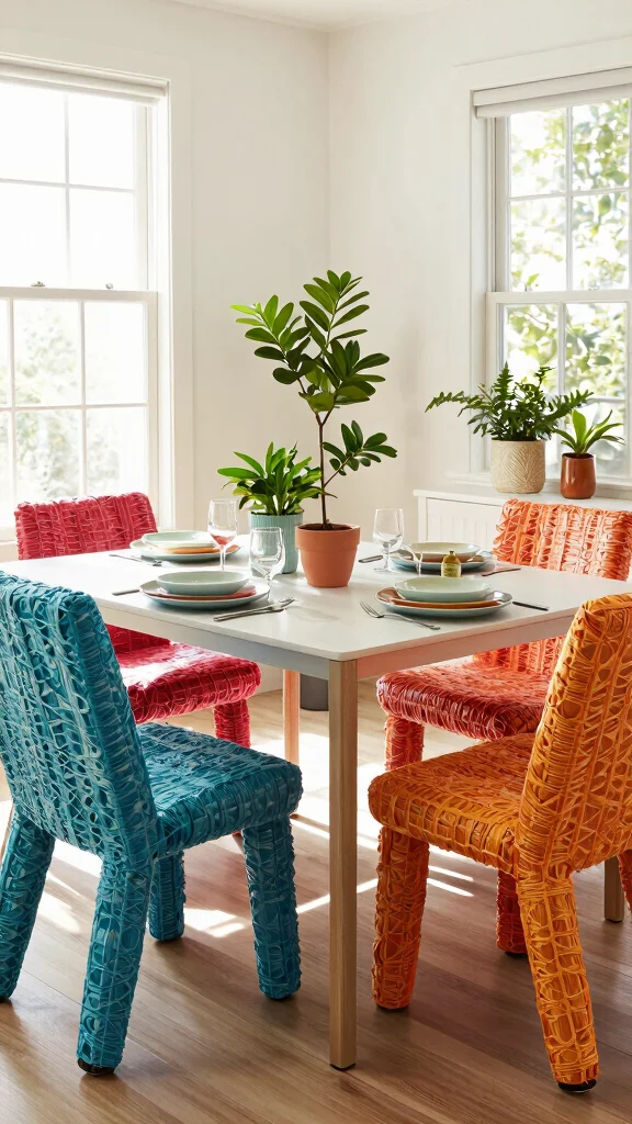 Colorful plastic chairs made from recycled materials add a vibrant touch to any dining room. They are lightweight, easy to clean, and available in various bold hues, making them versatile for different decor styles. These cheerful chairs can create a playful atmosphere in your dining space.