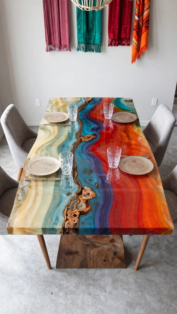 Consider tables with colorful resin elements to add a vibrant touch while ensuring uniqueness in your dining space.