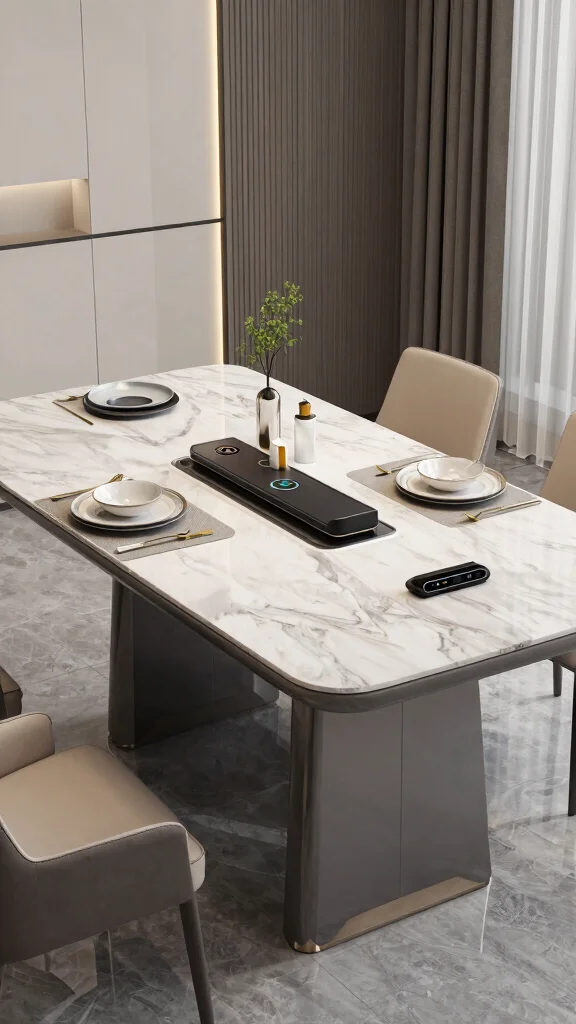 When styling a tech-integrated dining space, choose sleek, contemporary decor that complements the table’s design. Elegant table settings can enhance the high-tech vibe; think futuristic dishware and minimalist centerpieces.