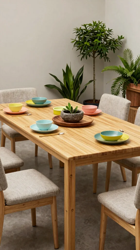 Fun fact: Bamboo can grow up to 35 inches in a single day under ideal conditions, making it a truly renewable material for dining table design. It’s lightweight, strong, and naturally antibacterial, perfect for everyday meals and eco-friendly homes. Pair it with colorful dishware for a vibrant, sustainable table.